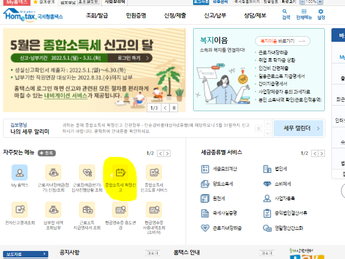 그 후 자주 찾는 메뉴에서 종합소득세 확정신고를 클릭합니다.