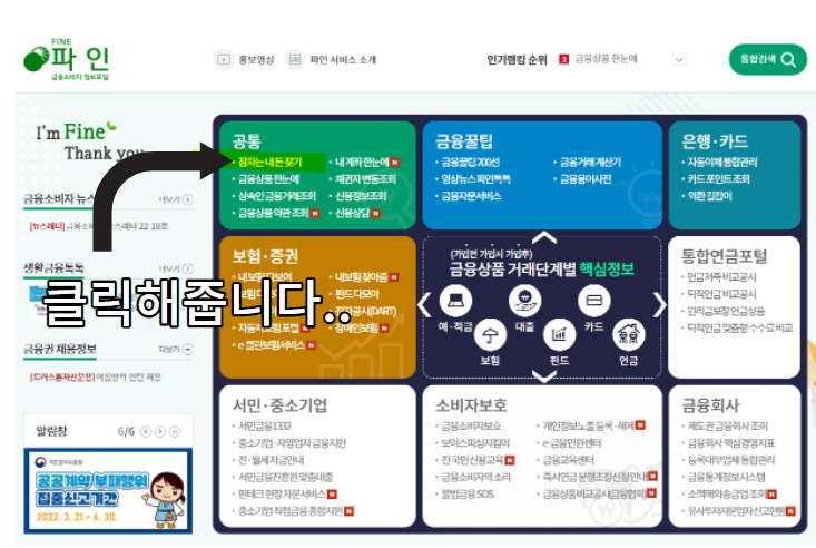 전면 홈페이지에서 잠자는 내돈찾기를 클릭해줍니다.