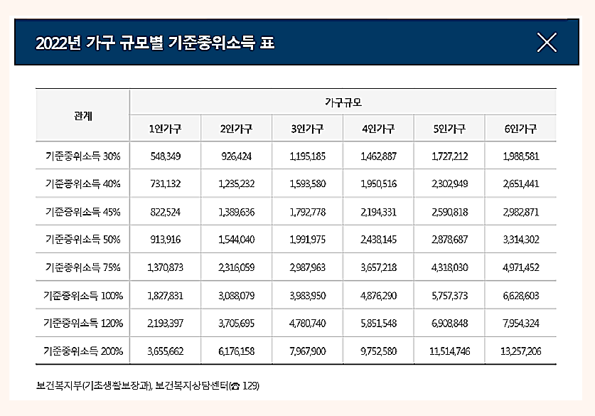 - 아래 표에 기준 중위소득표도 같이 있어서 혹시나 필요하신 분은 참조하시면 좋을 것 같습니다.