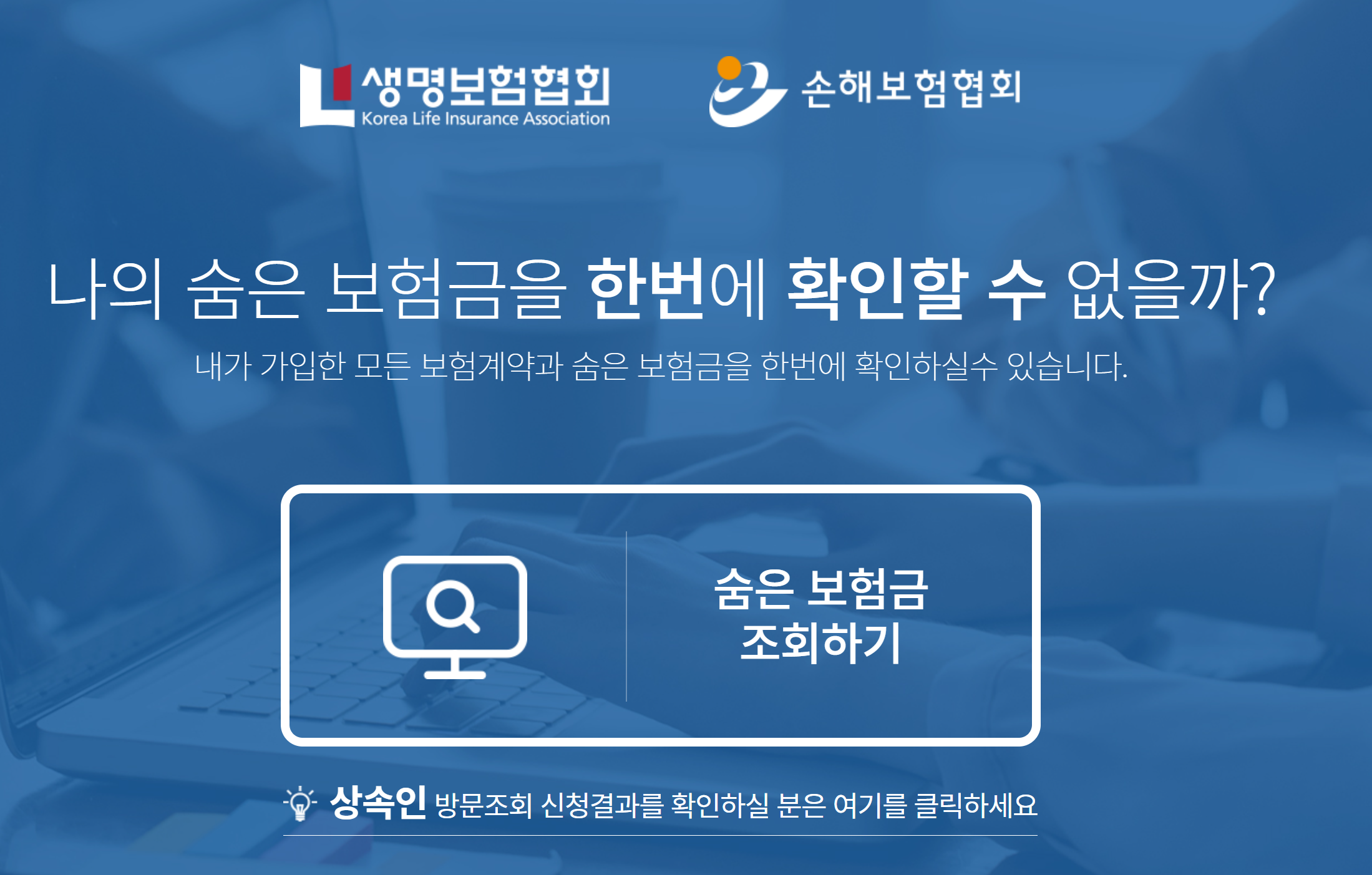 나의 숨은 보험금을 한번에 확인할 수 없을까? 내가 가입한 모든 보험계약과 숨은 보험금을 한번에 확인하실수 있습니다. 숨은 보험금조회하기 상속인 방문조회 신청결과를 확인하실 분은 여기