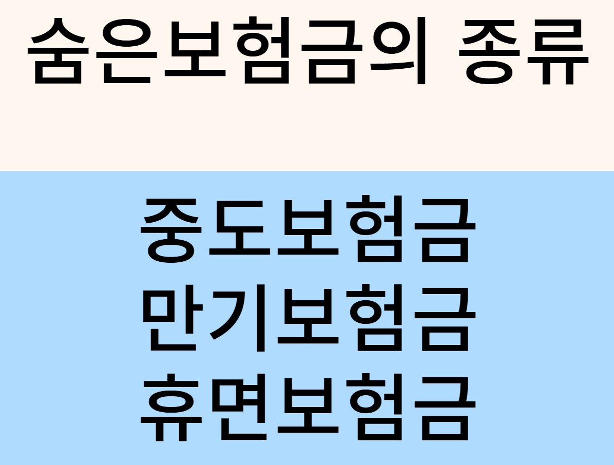 숨은 보험금의 종류에는 중도보험금 만기보험금 휴면 보험금이 있습니다.