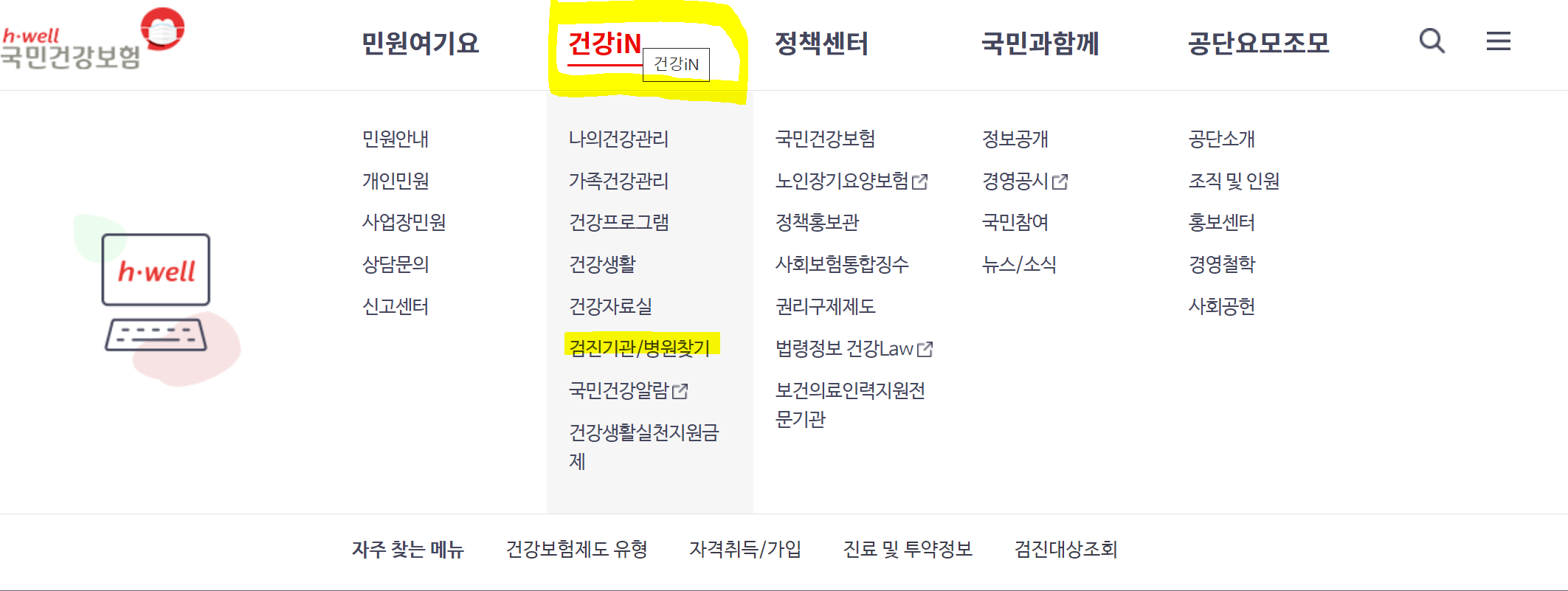 홈페이지 메뉴란에 건강 in - 검진기관/병원 찾기를 누르시면 지금 계신 지역의 병원을 찾아보실 수 있습니다.