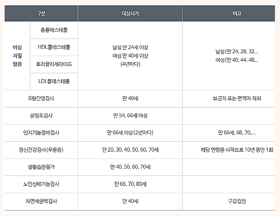 국가 건강검진 요소는 신장, 체중, 허리둘레 , 체질량지수 같은 기본적인 신체사이즈부터 시작하여 시력, 청력, 골다공증, 정신건강, 인지기능 장애 검사, 노인 신체기능 검사까지 연령대별로 받을 수 있는 신체검사들이 나눠져 있습니다.