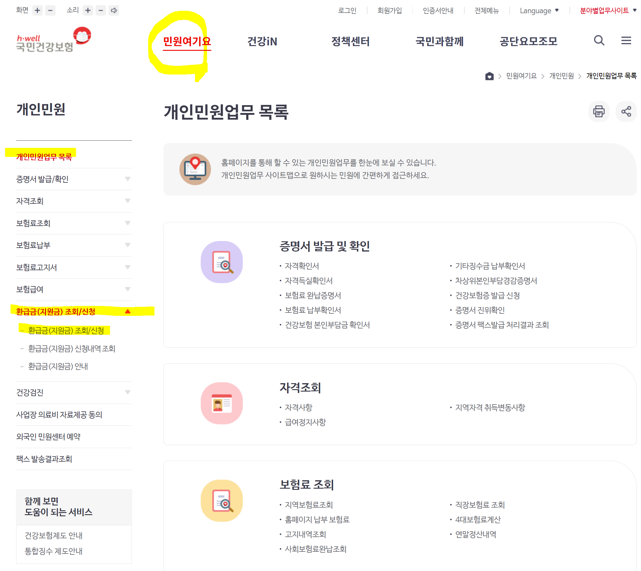 2. 위에 있는 메뉴 중 민원 여기요 클릭 -개인 민원 클릭 -왼편 목록의 환급금 조회 클릭으로 확인해보실 수 있습니다.