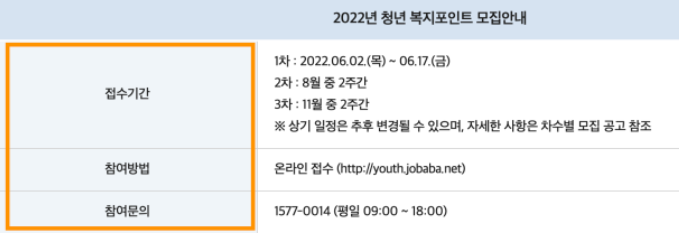 2022년 신규 선발 모집 일정 안내 (중소기업 청년 노동자 지원사업) - 1차 모집 : 5.2.(월)~5.16.(월) - 2차 모집 : 10.4.(화)~10.18.(화) (청년 복지포인트) - 1차 모집 : 6.2.(목)~6.17.(금) - 2차 모집 : 8.1.(월)~8.16