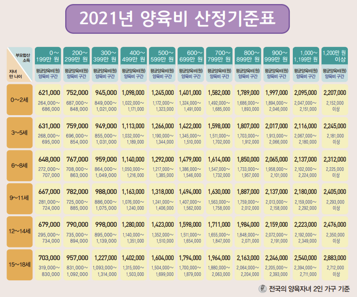2021년 양육비산정기준표를 확인해보시기 바랍니다.