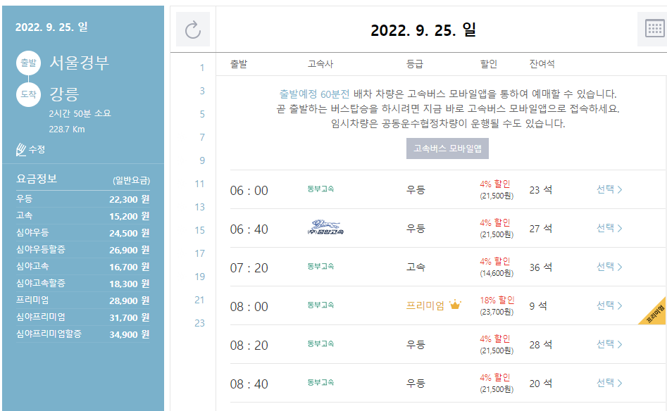 버스 시간표와 가격을 확인할 수 있습니다. 고속버스 모바일 어플리케이션으로도 확인가능합니다.